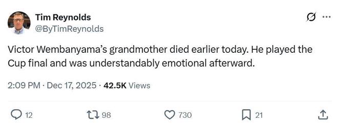 只不過,文班亞馬的低迷情有可原,根據(jù)馬刺跟隊記者Tim Reynolds報道,文班亞馬的祖母在今天早些時候去世,文班堅持完賽,賽后采訪難掩情緒傷心落淚。