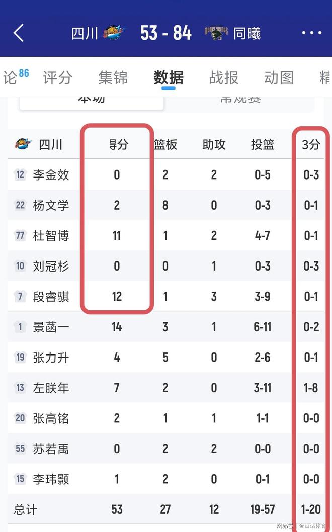 賽后的技術(shù)統(tǒng)計,真的不忍卒讀。四川隊全場總共得53分,去掉罰球的14分,實際上動動戰(zhàn)只得了39分。全隊除了景菡一和段睿騏得分上雙,首發(fā)李金效0分,劉冠杉0分,楊文學(xué)2分。全隊總共只有12次助攻,籃板球輸了同曦幾20個,失誤14次。更令人尷尬的是,全隊有8名球員在三分線上出手20次,僅命中一球,命中率為5%。