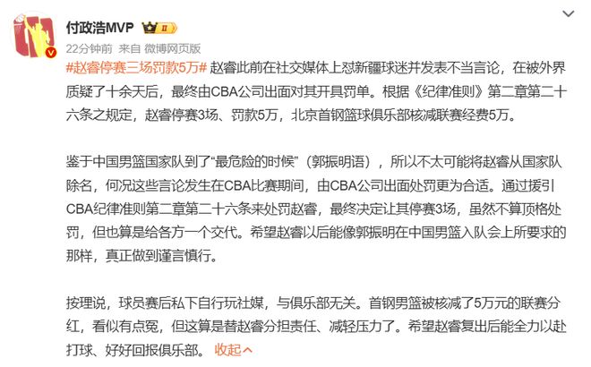 看到CBA公司對趙睿的處罰,我第一反應(yīng)不是“罰得重不重”,而是“怎么才來?”趙睿不是第一次因為情緒失控惹麻煩了,從當(dāng)年在廣東時跟球迷互懟,到在新疆期間沖撞裁判,再到這回的“打馕”言論,這劇本真的一遍遍在重演,你說他是壞人,我覺得不至于,球員賽后輸球、心里憋屈,回家又打開手機看到有人冷嘲熱諷,一時上頭懟回去,這種情緒其實能理解,但問題是你不是普通網(wǎng)友,你是公眾人物,你是中國男籃的隊長!