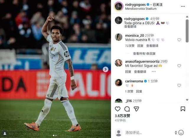 在比賽結(jié)束后,巴西人也在社交媒體上曬出了自己取得進(jìn)球之后慶祝照,并配上了“榮耀歸于上帝”的文字,值得關(guān)注的是,這也是羅德里戈自今年1月份在西甲聯(lián)賽破門(mén)之后的首次破門(mén),此前他曾打破皇馬隊(duì)史這個(gè)位置球員最長(zhǎng)進(jìn)球荒的記錄。