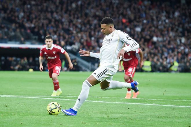 本場比賽,姆巴佩與羅德里戈、維尼修斯組成了皇馬的鋒線三叉戟。開場之后,塞維利亞踢得并不保守,多次威脅庫爾圖瓦把守的球門。第17分鐘,居萊爾前場拿球時(shí)無視中路包抄到位的羅德里戈,將球分給邊路插上的姆巴佩,結(jié)果后者一腳打偏。第39分鐘,羅德里戈任意球助攻貝林厄姆頭球破門首開紀(jì)錄。而這次進(jìn)攻,身為中鋒的姆巴佩出現(xiàn)在禁區(qū)弧頂附近。半場結(jié)束,皇馬1-0領(lǐng)先。