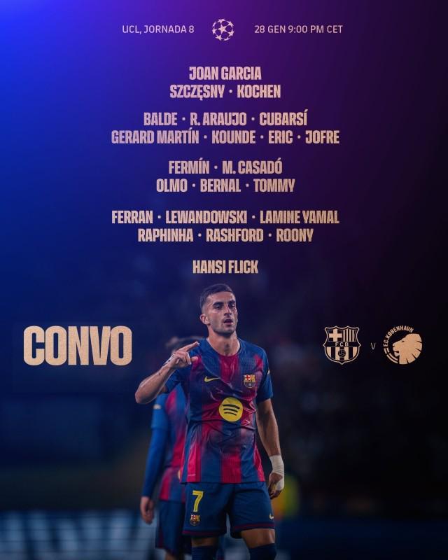 歐冠聯(lián)賽階段第8輪,巴塞羅那主場迎戰(zhàn)哥本哈根。紅藍軍團公布大名單,亞馬爾、拉菲尼亞、萊萬領銜,費蘭回歸,阿勞霍在列。 巴薩大名單 門將:霍安·加西亞、什琴斯尼、科琴 后衛(wèi):亞歷克斯·巴爾德、阿勞霍、庫巴西、赫拉德·馬丁、孔德、埃里克·加西亞、托倫茨 中場:費爾明、卡薩多、奧爾莫、貝爾納爾、托米·馬克斯 前鋒:費蘭、萊萬多夫斯基、亞馬爾、拉菲尼亞、拉什福德、巴爾德吉