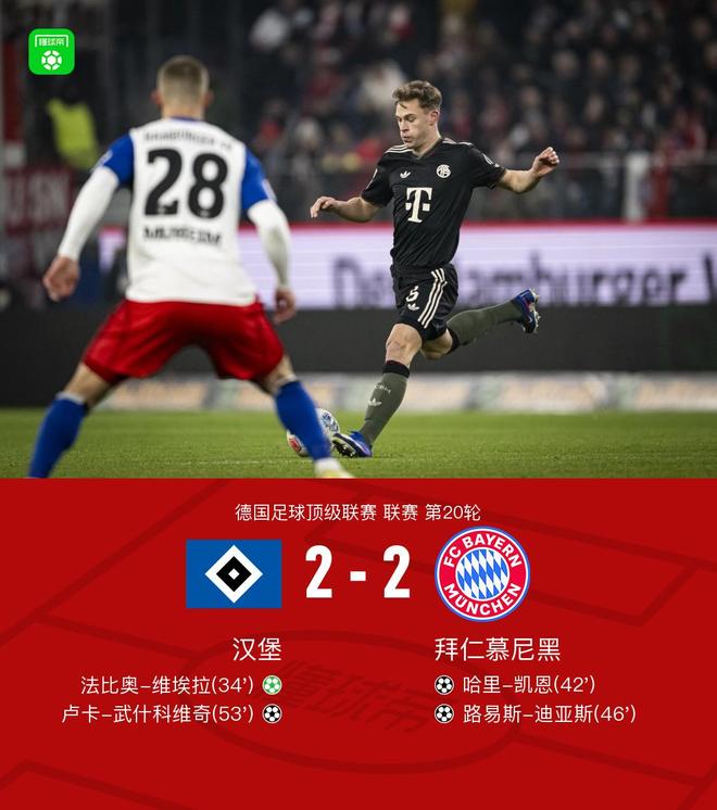 北京時間2月1日德國足球頂級聯(lián)賽 聯(lián)賽 第20輪,漢堡主場對陣拜仁慕尼黑。漢堡法比奧-維埃拉破門,盧卡-武什科維奇破門。拜仁慕尼黑哈里-凱恩破門,路易斯-迪亞斯破門。最終比分漢堡 2-2 拜仁。