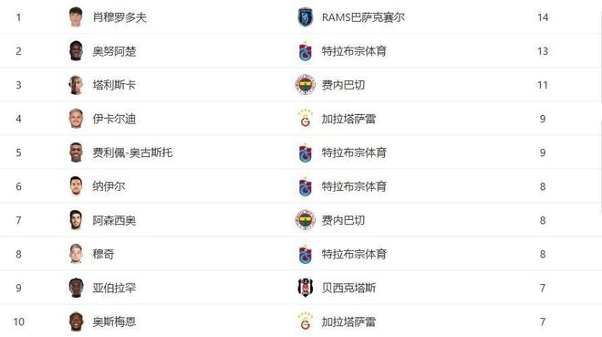 算上本場比賽的進球,本賽季土超射手榜上,肖穆羅多夫以14球繼續(xù)領(lǐng)跑,要知道在這位烏茲別克斯坦鋒霸身后是昔日國米隊長伊卡爾迪(9球)和那不勒斯曾經(jīng)的大腿奧斯梅恩(7球),這兩位曾在意甲風光無限的金靴得主,現(xiàn)在在土耳其的賽場上竟被一位“意甲棄將”遠遠甩開。