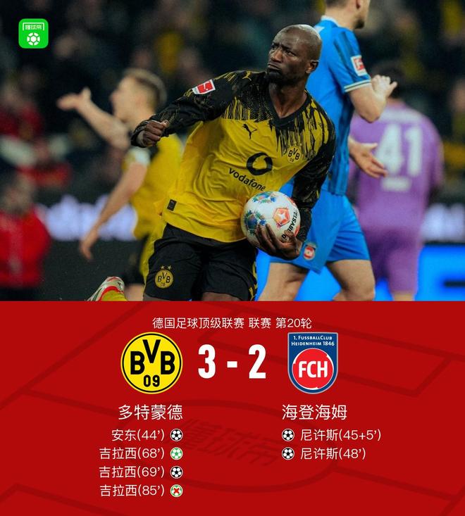 北京時(shí)間2月2日德國(guó)足球頂級(jí)聯(lián)賽 聯(lián)賽 第20輪,多特蒙德主場(chǎng)對(duì)陣海登海姆。上半場(chǎng)拉馬伊脫手,安東破門,之后馬內(nèi)突然受傷,尼許斯破門扳平。下半場(chǎng)尼許斯遠(yuǎn)射折射破門完成雙響反超比分,之后多施手球送點(diǎn),吉拉西主罰命中扳平比分,隨后吉拉西一分鐘內(nèi)再度破門火速反超,之后吉拉西將自己創(chuàng)造的點(diǎn)球打飛。最終多特3-2戰(zhàn)勝海登海姆。