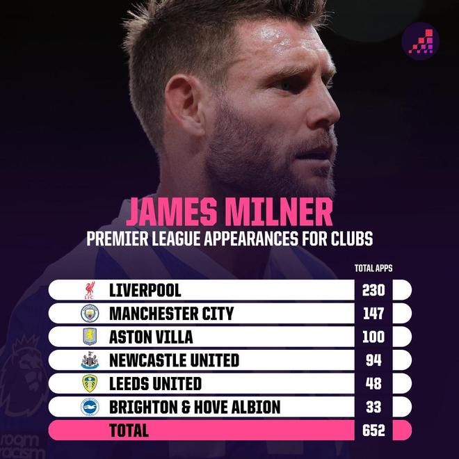 據(jù)統(tǒng)計,米爾納已經(jīng)在英超出場652次,如果周日他出戰(zhàn)水晶宮,這位40歲老將將追平由巴里保持的英超歷史出場紀錄(653場)。