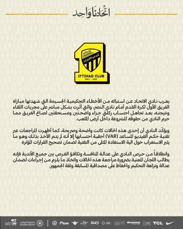 吉達(dá)聯(lián)合官方:球隊(duì)對陣勝利理應(yīng)獲得兩個(gè)點(diǎn)球,要求進(jìn)行審查