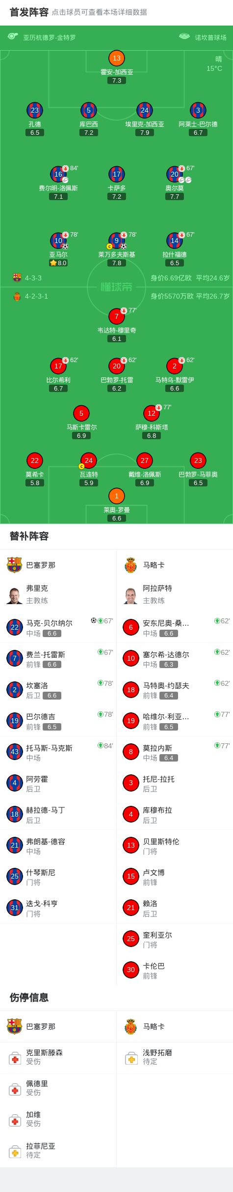第29分鐘,禁區(qū)內球反彈到奧爾莫腿上,萊萬調整后破門,巴薩1-0馬略卡