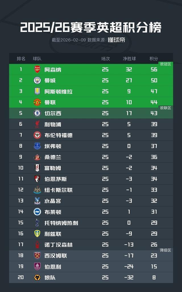 北京時間2月9日,2025/26賽季英超聯(lián)賽結(jié)束了第25輪的全部比賽,積分榜的形勢也產(chǎn)生了進一步的變化。