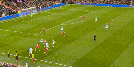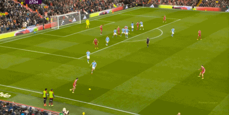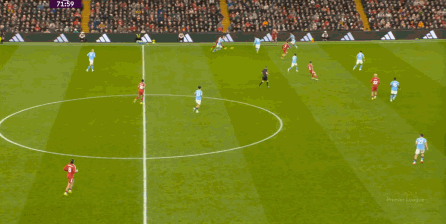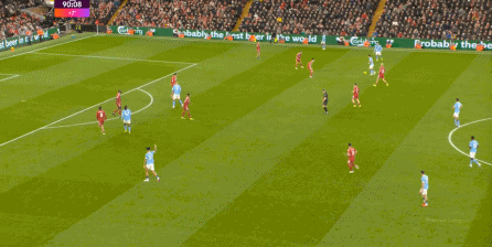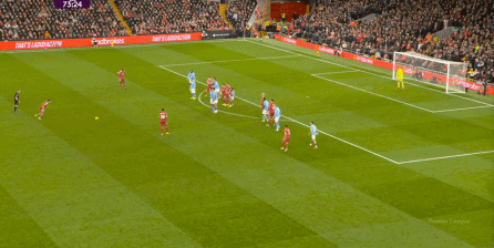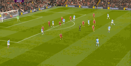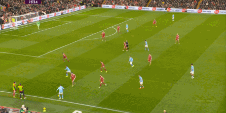 這在戰(zhàn)術(shù)上不會(huì)有特別明顯的變化,所以曼城的表現(xiàn)并未立刻改善,于是在第73分鐘,利物浦在由左至右的轉(zhuǎn)移過(guò)程中打出進(jìn)攻,隨后在二點(diǎn)爭(zhēng)奪中制造了定位球: