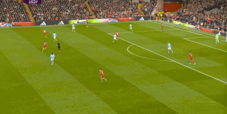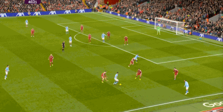當(dāng)然了,利物浦的進(jìn)攻威脅程度和曼城還是沒(méi)法比,薩拉赫的確不負(fù)當(dāng)年之勇,但埃基蒂克和維爾茨也沒(méi)有什么像樣的表現(xiàn),所以曼城很快重新掌握大局,在第33分鐘,用利物浦的失誤和自身的跑位,帶著維爾茨的羅德里在右路送出了傳中: