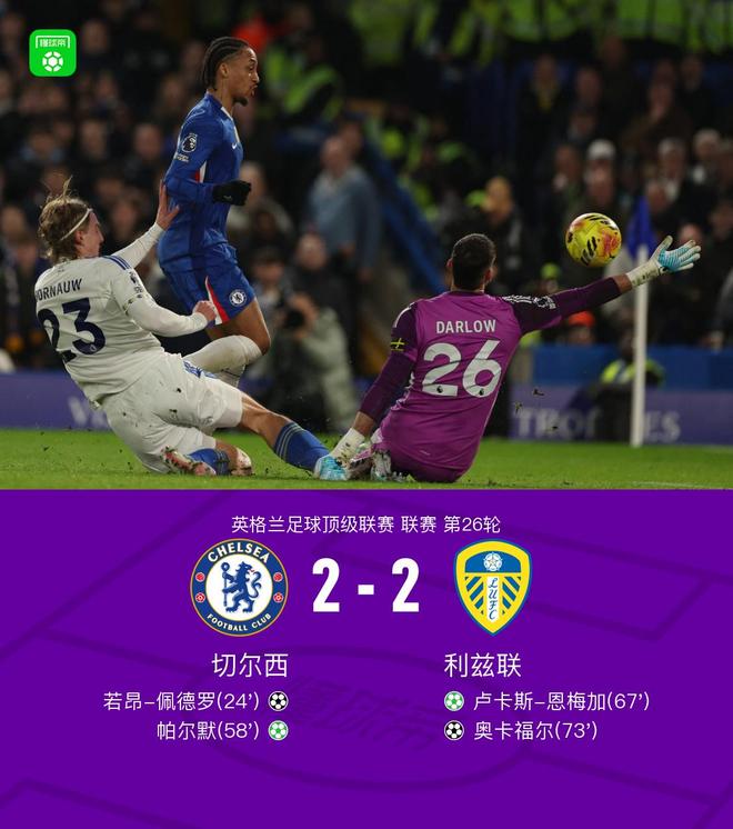 北京時間2月11日英格蘭足球頂級聯(lián)賽第26輪,切爾西主場對陣利茲聯(lián)。上半場,帕爾默助攻,佩德羅挑射破門。下半場,佩德羅造點,帕爾默主罰命中,隨后,利茲聯(lián)連入兩球,扳平比分,恩梅加點射破門,奧卡福爾推射建功。最終比分切爾西 2-2 利茲聯(lián)。