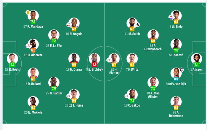 利物浦首發(fā):1-阿利松、26-羅伯遜、4-范戴克、5-科納特、38-赫拉芬貝赫、3-遠(yuǎn)藤航(69’2-戈麥斯)、10-麥卡利斯特、7-維爾茨、11-薩拉赫、18-加克波(75’17-瓊斯)、22-?;倏耍?8’14-基耶薩)。